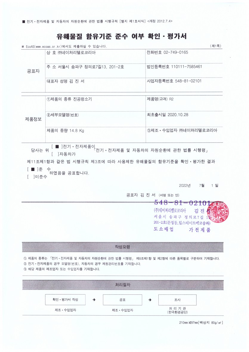 유해물질 함유기준 준수 여부 확인서 페이지 정보 작성자 최고관리자 댓글 0건 조회 1,822회 작성일 22-07-01 15:07 본문 모델 R2 제품명 진공청소기 목록 답변 다음글리텔로 영업직원 모집 20.09.21 댓글목록 댓글목록 등록된 댓글이 없습니다.